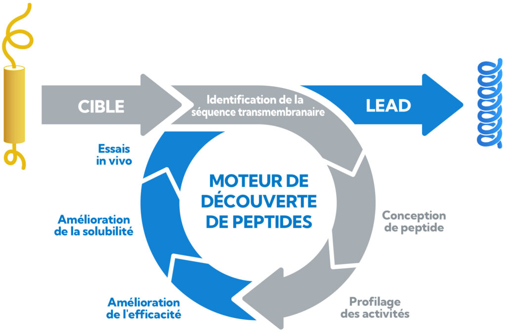 Nous disposons d’un moteur de découverte de peptides qui nous permet de concevoir intelligemment des peptides ciblant les domaines transmembranaires de récepteurs pharmacologiquement pertinents impliqués dans des processus biologiques clés.